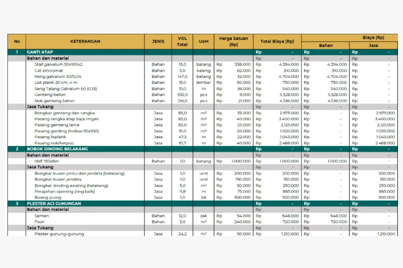 Dokumen ini transparan, menyajikan daftar material dan ongkos tukang secara detail, sehingga klien tahu persis ke mana dana dialokasikan.